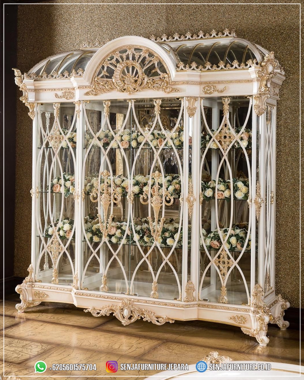 Dengan ruang penyimpanan yang mencukupi, Anda dapat dengan mudah menata koleksi barang berharga Anda. Lemari Hias Klasik adalah pernyataan gaya yang berkelas dan memberikan sentuhan elegan yang akan meningkatkan estetika ruangan Anda dengan gemilang. Dibuat dengan detail yang teliti dan perpaduan antara kayu yang indah serta ukiran yang memukau, Lemari Hias Mewah ini tidak hanya menawarkan fungsi praktis sebagai tempat penyimpanan, tetapi juga menjadi titik fokus yang menarik perhatian tamu ketika berkunjung ke rumah Anda.